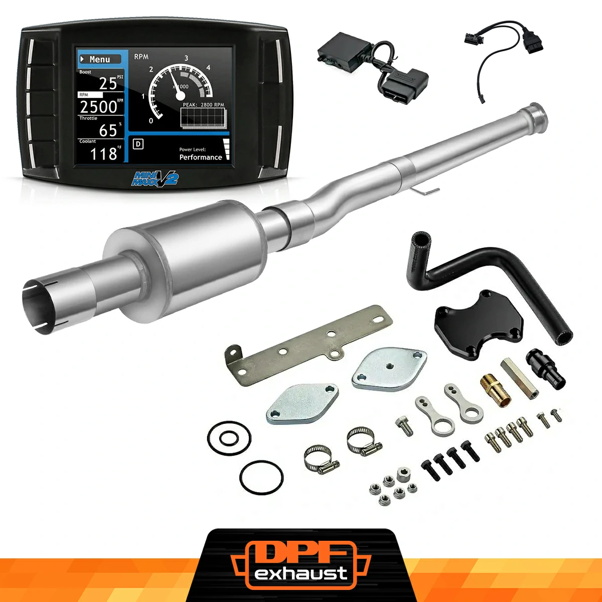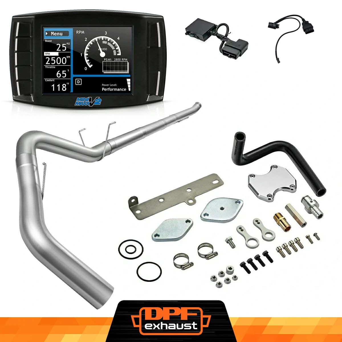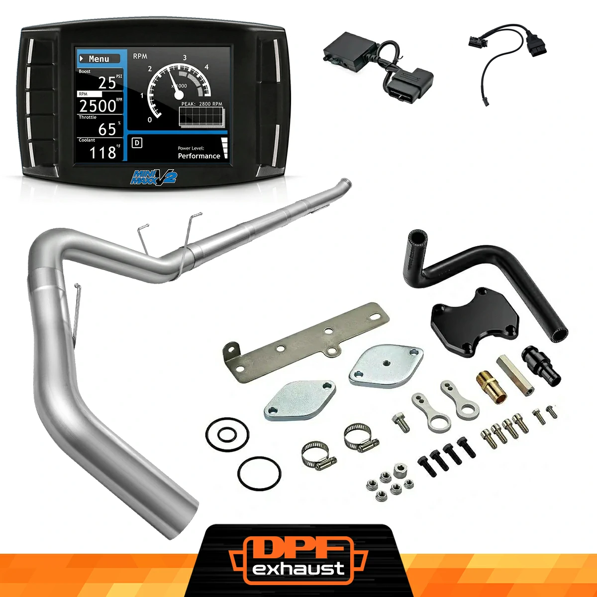 This kit comes with everything you need to upgrade your 2019-2021 6.7L Cummins. Inside, you'll find the Mini Maxx V2 Delete Tuner, an EGR Delete Kit, and a DPF Delete Race Pipe. Each component is designed to work seamlessly together, giving your truck a performance boost while simplifying installation.